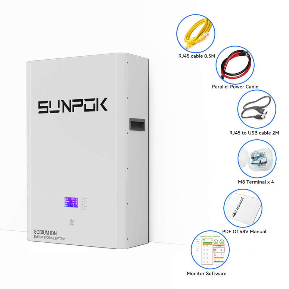 La batteria al sodio di Sunpok Energy (noto anche come batteria al sodio o batteria agli ioni Na) offre un'elevata sicurezza, un tempo di ricarica veloce e un'elevata capacità.3, ROHS, IEC62619 e CE, e ha una tensione nominale di 48V/51.2V.